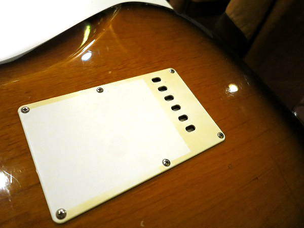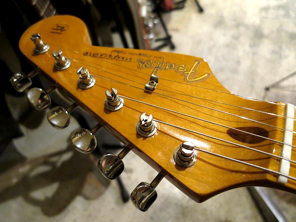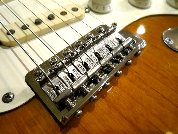 ブリッジは6点止めシンクロナイズドで、ブリッジサドルはFender刻印入りのヴィンテージタイプ・サドル、