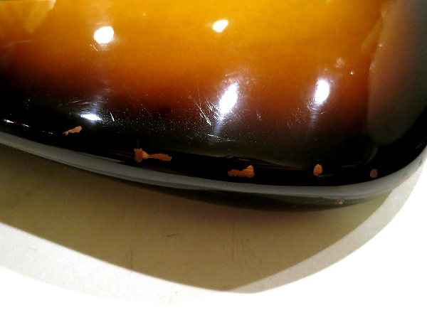 外観的にはナチュラルなレリック感のある雰囲気あるルックスです。 全体的に徹底的にクリーニング、さらにコンパウンド、ポリッシュにより、 研磨、光沢出しを行っておりますので、塗装やハードウェアの光沢、艶も取戻し 綺麗な美品コンディションになっております。 ボディの塗装が非常に極薄なのもありますが、 ボディはエッジ部分、サイド等を中心に、塗装剥がれが多々ございます。 バック側のサイドにはやや大きめの塗装剥がれもあります。 トップにも塗装剥がれや擦り傷、1ヶ所少々深めの打痕傷もあります。 また、塗装は既にウェザーチェックが出ている箇所もあります。 非常に薄い塗装と乾燥を実感させます。 その他全体的に小傷、擦り傷、相応に使用感、経年感がございますが、 ナチュラルなエイジド感、愛用されたヴィンテージライクな雰囲気を持ったグッドルッキンな1本です。 ケースは純正ブラウン・ハードケースが付属します。