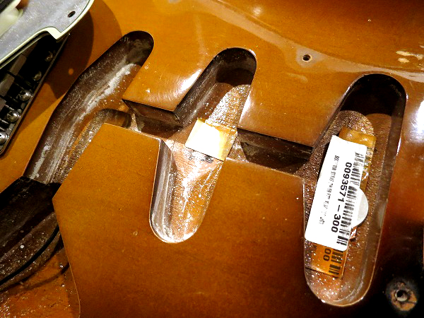 SWで、 ピックガード裏面にはアルミシールドが施され、キャパシターなどを見ても、