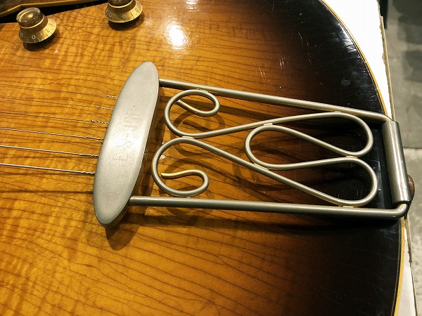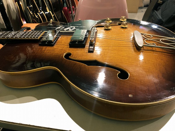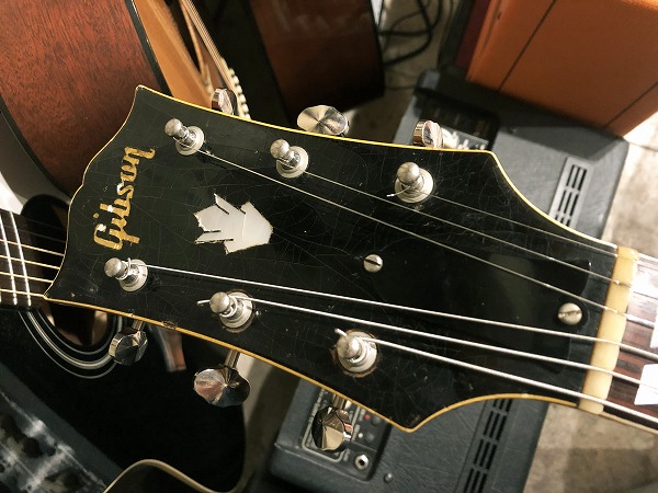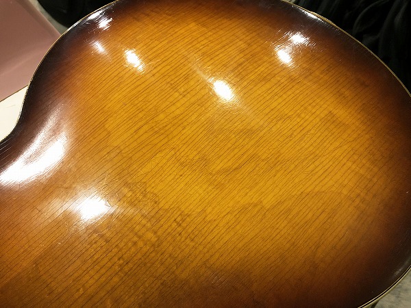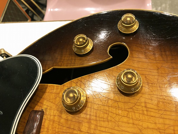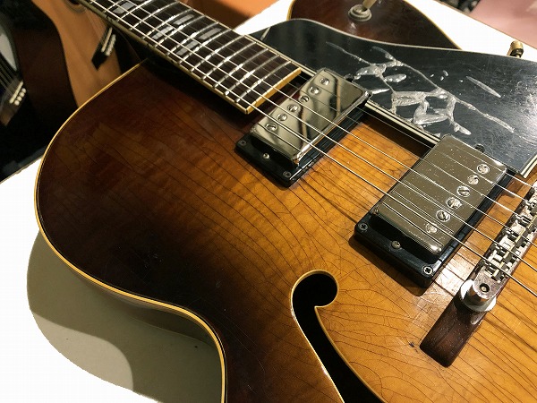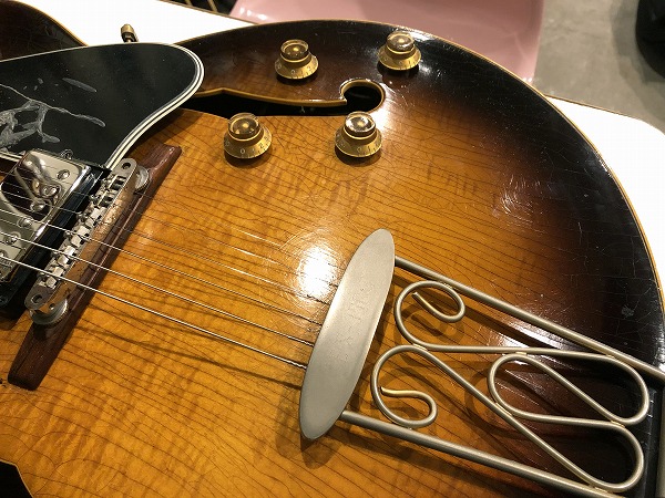 まずトップは非常に美しくトラ杢の浮き出たメイプルで、バック、サイドも同様にかなりトラ杢が浮き出ており、乾ききって全面にビッシリと入った塗装のウェザーチェック、経年したサンバーストのカラーと相まって、その存在感、雰囲気は抜群の素晴らしいルックスとなっています。もちろんその見た目だけでなく、鳴り感、音色も極上のヴィンテージサウンドとなっています。フルアコ構造ならではのふくよかで豊かな箱鳴り感に、ラミネート・メイプルならではのクリアーでスッキリとしたハリと芯のある音色、乾ききった木材と塗装による、抜群のドライな乾いたヴィンテージトーンは抜けも抜群で、響き良く、クリアーで透明感ある、かつ乾いてこなれたまとまりのあるまろやかさも持った、極上ヴィンテージトーンを生み出しています。