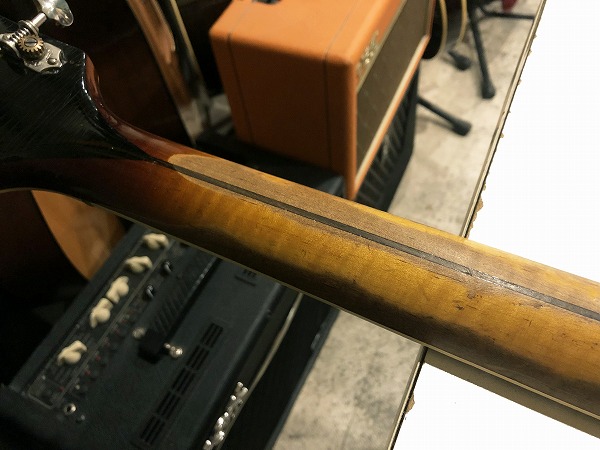 さらに全体的にしっかりとメンテナンス、セットアップを施しておりますので、弦高はローアクションで弾きやすく、ビビリやつまりも無く、良好な出音になっています。現在弦高は12フレット上1弦1.5mm、6弦1.5mmです。電装系は全交換されていますが、こちらも大きなガリや接触不良等も無く、各チェック、メンテナンス済で、出音、各コントロール共に全て良好で問題ありません。ペグも交換されていますが、動作・マッチング共に問題無く、良好なコンディションです。プレイコンディションは良好で、さらに調整、セットアップ済の非常に良好なグッドプレイコンディションです。