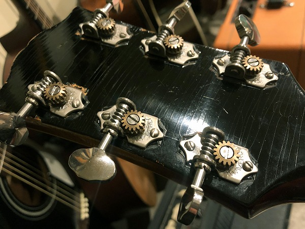 ( カラハム ) 製に交換されています。不純物の含まないピュア・スティールの削り出しで製作された、ハイグレードなリプレイスメント・ブリッジです。テールピース部分はオリジナルで、「ES-350・T」の刻印が入っています。ペグも交換されており、現在はWAVERLY製のオープンバックのペグが搭載されています。こちらも精度も高く、仕上がりも良く高級感溢れる、ハイグレードペグです。ピックガードも交換されています。いつぐらいの時期のものか、またメーカー等も不明ですが形状は合っています。保護フィルムが残ったままになっていて、やや剥がれている箇所があります。また、コントロールノブも新しいものに全交換されています。
