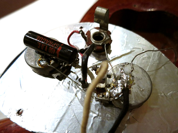 コンデンサーにはスプラグ・ブラック・ビューティー搭載、ピックガード裏はアルミ処理済など