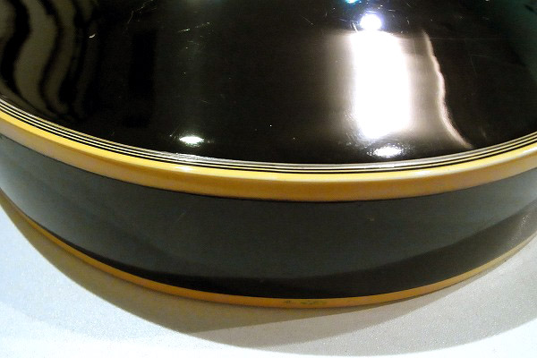 グロスブラックのボディにゴールドのハードウェア、多層バインディング、