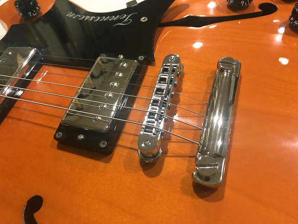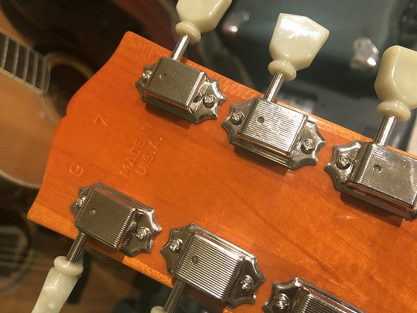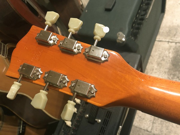 ブリッジはチューン・オー・マチック+ストップテールピースタイプ、ペグはロック式のクルータイプ・グリーンキーです。