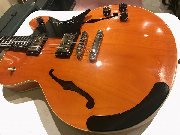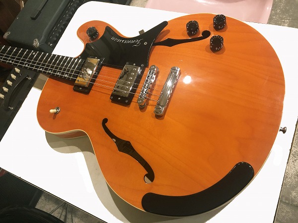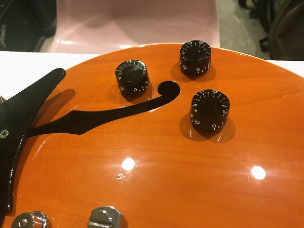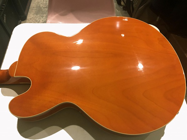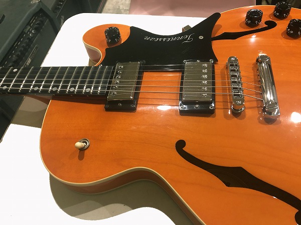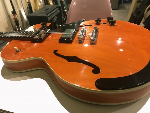 16インチのTHINボディスタイル、センターブロック入りのセミホロウ構造で、メイプルボディ、メイプルネック、指板にはエボニーが用されているのが特徴的な仕様で、エルボー部にエルボーパットが装備されているのも特徴的です。