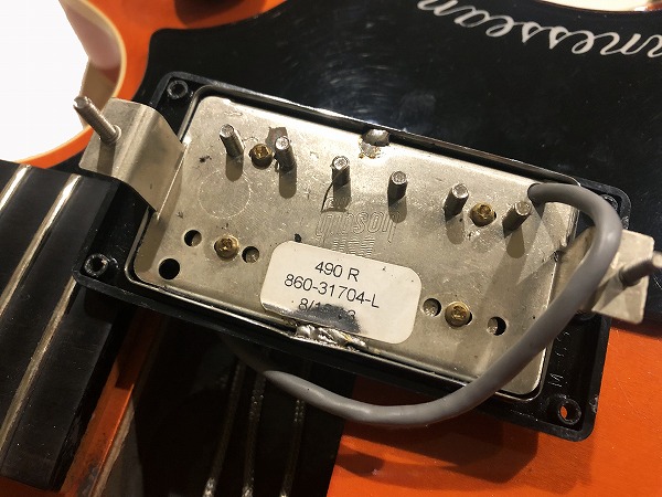 ピックアップはフロントに490R、リアはステッカーがありませんので特定出来ませんでしたが、Gibson USAロゴ刻印入りで、498Tなど同系統のモデルです。PAF系57クラシックをベースにしつつ、よりハイ・ミッドを強調し、出力も高めなのが特徴的で、レスポンスも良く、ピッキングニュアンスもナチュラル、抜けの良いクリアーなサウンドです。ややソフトなアタック感で、まとまりも良くこなれた感があり、バラバラにならずとても使いやすいサウンドでもあります。本体のサウンドと相まって、グッドオールドなオーセンティックなカントリースタイルやロックンロールスタイルには抜群のサウンドの、素晴らしいサウンドの1本です。
