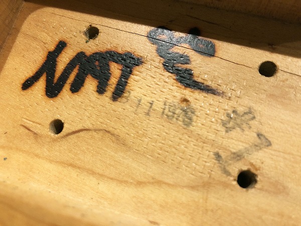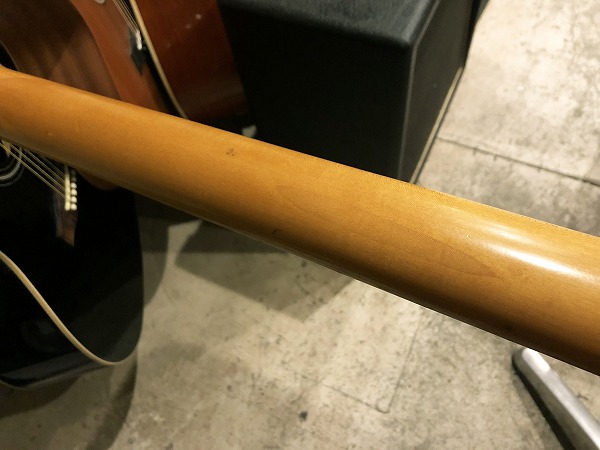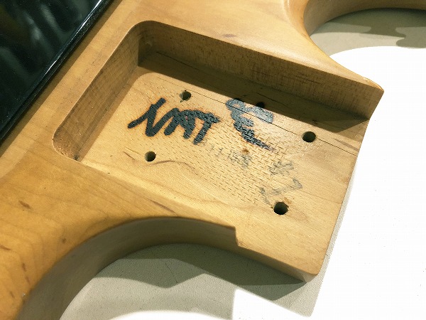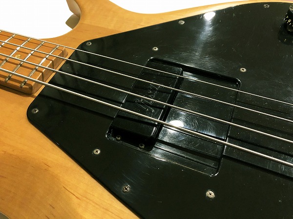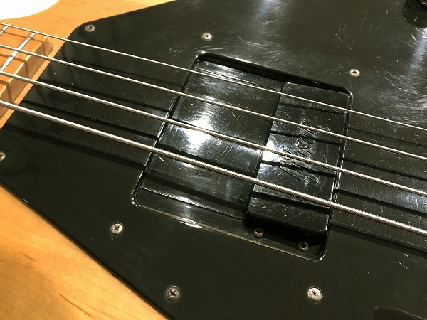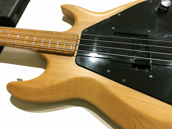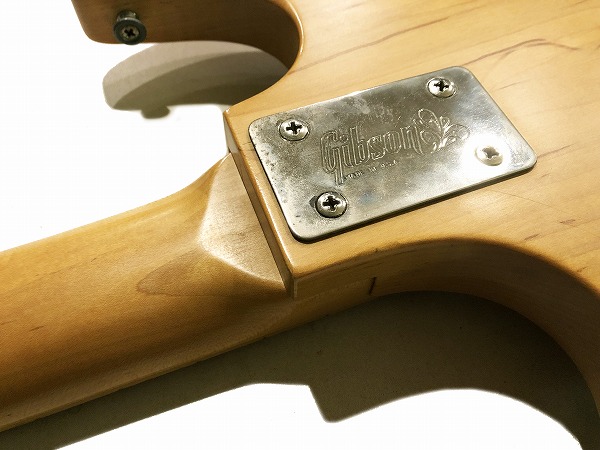ヘッド裏刻印シリアル "9*****" の6桁シリアル、ボディのネックポケット部には製造のスタンプもあり、197まではしっかり読めますが、最後の数字がやや見づらく正確には定かではありませんが、おそらく6で1976年製の1本と思われます。ただ、ボディ材は所々にトラ杢も入っており、全体重量は4.20kg(デジタルはかり計測)とやや重量もありますので、ボディはおそらくメイプルと思われます。ネックもメイプル、指板もメイプルの張り指板といった仕様で、ジョイントはボルトオン仕様となっています。ネックはナット幅40mmと細身で、ネックシェイプはやや丸みを帯びたしっかりとしたタイプで、こちらも見かけによらず、思ったより弾きやすいのも特長です。スケールはロングスケールで、ピッチ感も安定しています。ピックアップはオリジナルのGibson