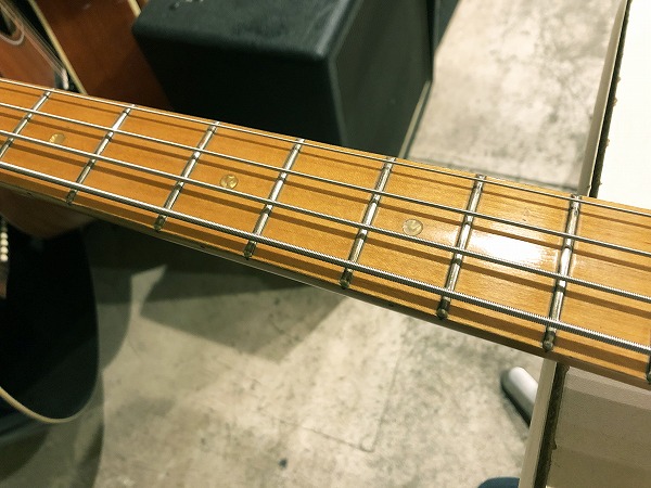 プレイコンディションは良好です。ネックはロッド調整済みで、反りも無く真っ直ぐで良好な状態に調整済です。ロッドはまだ若干の余裕がありますので、今後の調整にも対応します。フレットは相応に減りは見られ、6分程度の残りとなっていますが、大きなへこみや弦溝は無く、弾きやすく、各ポジション出音も良好です。フレットも丁寧に磨きを入れており、光沢も大分取り戻し綺麗なコンディションになっています。指板もやや傷、軽度の減り、使用感はありますが、大きな減りやダメージは無く、丁寧にコンディショニングも行っておりますので綺麗で良好な状態になっております。ナットも大きな減りなく良好なコンディションです。ブリッジ高さ調整ビス、オクターブ調整ビスなども動作良好で問題ありません。