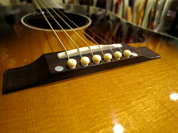 ボディシェイプはラウンドショルダーです。指板はローズウッド、ブリッジもローズウッドで、