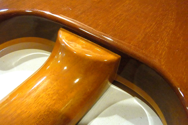薄めのボディ厚のマホガニーに対して、トップは7mm〜10mm厚のカーブドで貼られている為、
