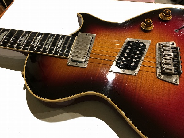 NighthawkはGibsonが1993年〜1999年頃の短い期間の生産で短命に終わったモデルで、従来のGibsonとは大きく趣が異なりFender系ギターも意識したような仕様のモデルとなっています。シェイプやルックス、素材はレス・ポールに近く、マホガニーバックにフレイムメイプルトップ、ネックはマホガニーネックのセットネック仕様にローズウッド指板で、2PU仕様のこのモデルはフロントにミニハム、リアにハムバッカーをスラントで搭載、ピックアップセレクターは5Way