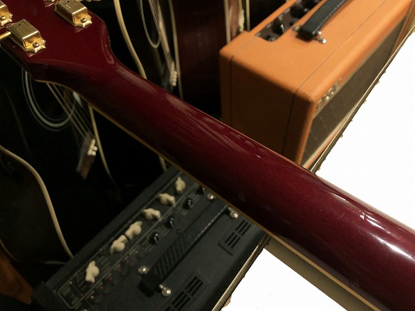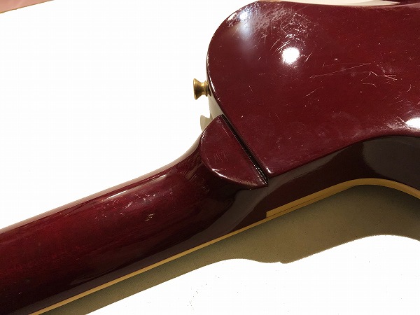外観的には相応に傷、経年感、使用感のあるプレイヤーズコンディションです。トップはいくつか打痕や小さな塗装剥がれが見られるほか、バックは打痕や塗装剥がれ、傷が多々見られます。ネック裏も小さな打痕や使用感はあります。金属パーツもくすみ等は見られ、相応のUSEDコンディションです、大きなひどいダメージは無く、また、全体的に丁寧にクリーニング、磨きも入れており綺麗な状態になっています。相応のプレイヤーズUSEDコンディションといった感じです。ケースはGibson純正ハードケースが付属しますが、鍵部分の留め金破損の他、ハードケース背面にはペイントやロゴ書きがあり、ハードケースのコンディションはあまり良くありません。ですが、運搬や保管には大きな問題はありません。