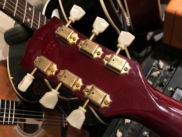 コンディションは良好です。外観的には相応に傷、経年感、使用感のあるプレイヤーズコンディションです。トップはいくつか打痕や小さな塗装剥がれが見られるほか、バックは打痕や塗装剥がれ、傷が多々見られます。ネック裏も小さな打痕や使用感はあります。金属パーツもくすみ等は見られ、相応のUSEDコンディションです、大きなひどいダメージは無く、また、全体的に丁寧にクリーニング、磨きも入れており綺麗な状態になっています。相応のプレイヤーズUSEDコンディションといった感じです。ネック、フレット、ピックアップ、電装系などプレイコンディションは良好で、相応に使用感や摩耗点はありますが、しっかりとメンテナンス、セットアップも行っており、弦高もローアクションで弾きやすく、出音も良好の良好なプレイコンディションです。ケースはGibson純正ハードケースが付属しますが、鍵部分の留め金破損の他、ハードケース背面にはペイントやロゴ書きがあり、ハードケースのコンディションはあまり良くありません。ですが、運搬や保管には大きな問題はありません。コンディションに関しては下記にさらに詳しく記載しておりますので、そちらをご参照下さいませ。