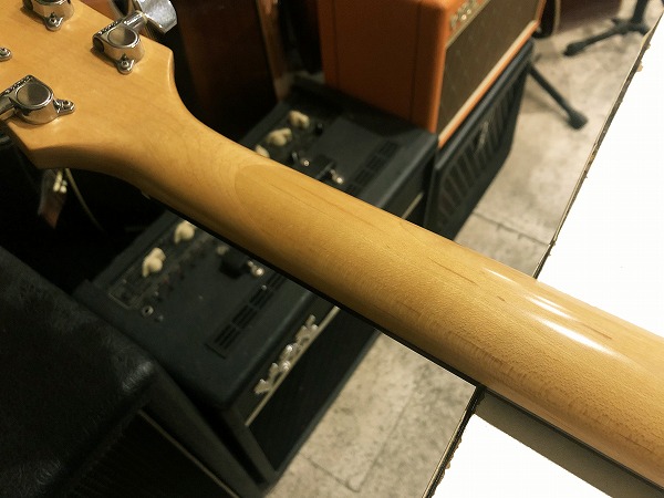 全体的にしっかりとメンテナンス、セットアップを施しておりますので、弦高はローアクションで弾きやすく、ビビリやつまりも無く、各ポジション良好な出音です。現在弦高は12フレット上1弦1.5mm、6弦1.8mmのローアクションで弾きやすいです。電気系統も各部メンテナンス、チェック済です。出音、各コントロール共に全て良好で問題ありません。ペグ動作も問題無く、良好なコンディションです。プレイコンディションは良好で、さらに調整、セットアップ済の良好なグッドプレイコンディションです。