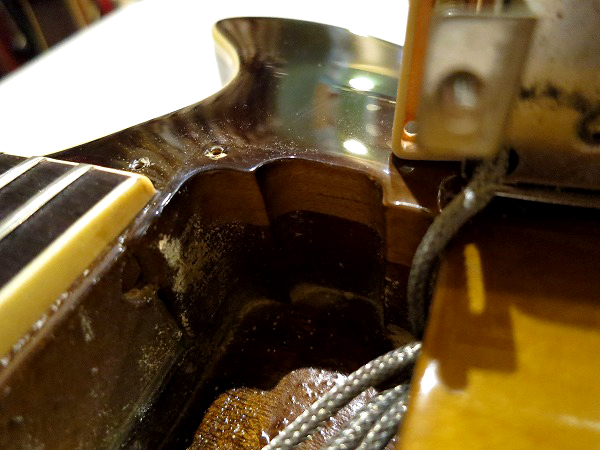 トップのメイプルはピックアップ・キャビティの断面を見ても分かるように、