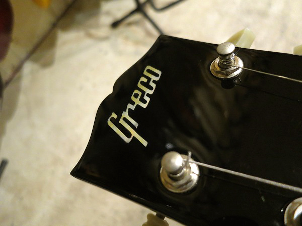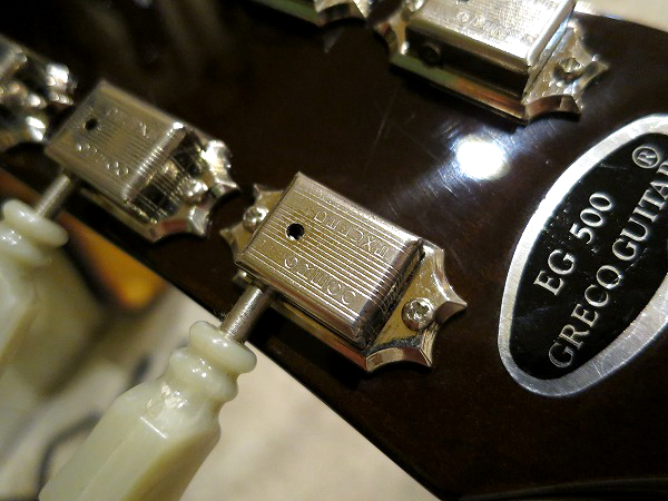ヘッドはスモールヘッド仕様、ペグは「GRECO DELUXE」刻印入りのクルーソンタイプ、グリーンキーで、