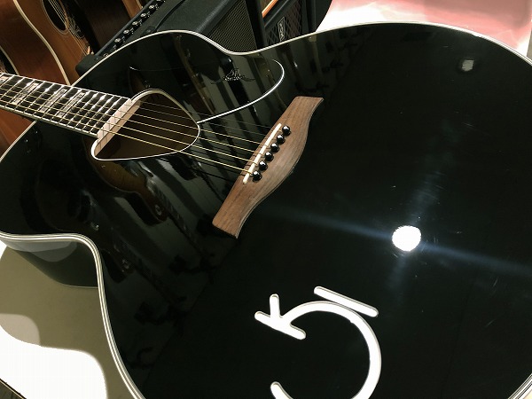 17インチ幅のジャンボ・ボディのオリジナルスタイルはソリッド・スプルース・トップ、プライウッド・メイプルのサイド&バックといった仕様で、三角形のトライアングル・サウンドホールも個性的な魅力です。ネックはメイプル2ピースで、指板はローズウッド、指板インレイにはウェスタン・モチーフが施されたブロック・インレイ仕様、ネックバインディング付き、3プライのブラックピックガードやヘッドストックにも牛のモチーフや、ボディの掘り込みのGマーク、カラーはブラックとホワイト、ハードウェアもクロームにまとめられ、Rancherの特徴を生かしつつクールでシックなロックなテイストに仕上げられた非常に格好良い1本です。塗装はポリですが、トップのスプルースの木目の凹凸もよく見れば分かるくらいに薄く仕上げられています。