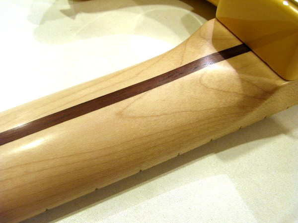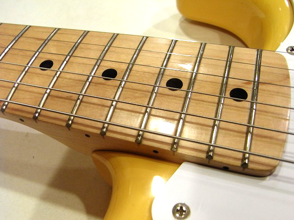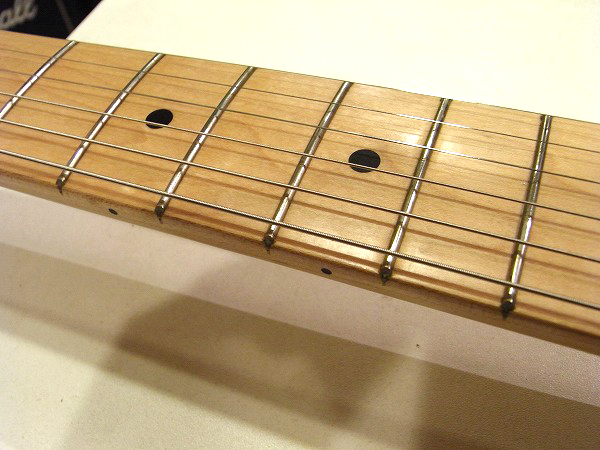 ネックは反りも無く真っ直ぐにロッド調整済で、 ロッドは適正に調整後、まだ余裕のある状態ですので、今後の矯正も問題ありません。 フレットも大きな減りは無く、9割がた残っており、弦溝やへこみもありません。 丁寧に磨きも入れておりますので、光沢もピカピカの綺麗なコンディションです。 現在弦高は12フレット上1弦1.5mm、6弦2mmと非常にローアクションなセッティングで、 この状態で各ポジション、フレットバズ(ビビリ)や音づまりも無く良好な出音です。 プレイコンディションは非常に良好です。 弦高も低く、とても弾きやすい状態で、調整済、各セッティングもバッチリの状態です。