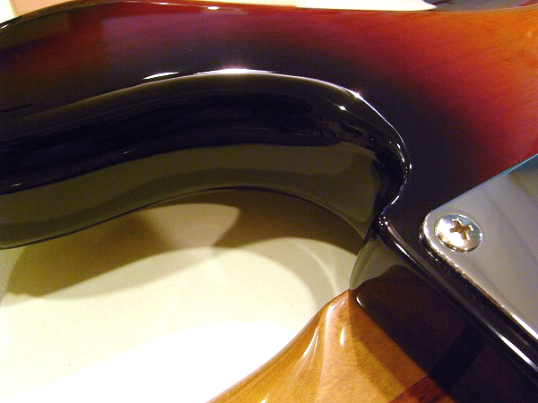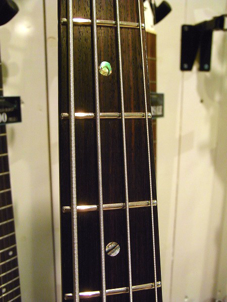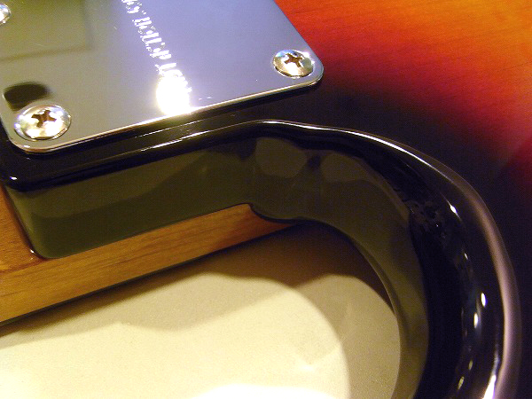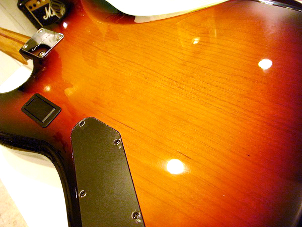 ボディはこちらも木目の美しい良質なアルダー材を採用。 センター2ピースの仕様です。 指板は、同じく非常に木目も綺麗で、目のつまった、とても良質なローズウッドが採用されています。 指板はスラブボード仕様で、21フレット仕様。 スラブボードは指板材とネック材の接着面がフラットに貼りつけられたタイプです。 (一方、ラウンドボードは接着面が指板のアール(湾曲)に対して平行にカーブして貼りつけされたタイプです。) スラブボードは必然的に指板の木材の質量が大きく、非常にタイトですっきりとしたサウンドと、 輪郭のはっきりとしたサウンドが特徴的です。 ネックはボルト・オン仕様で、ファースト・アクション・ジョイントを採用。