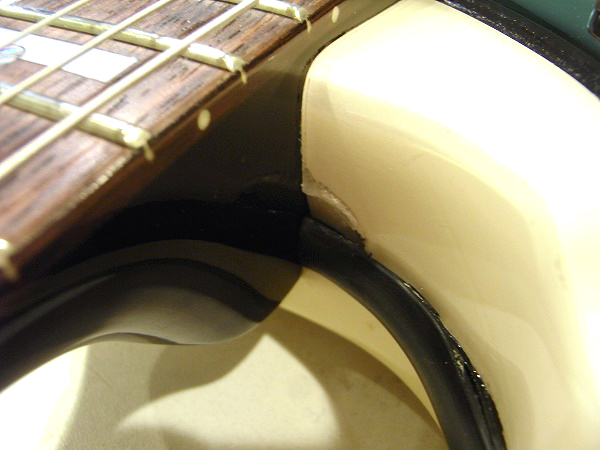 外観的にも、いくつか傷はあるものの、大きなダメージは無く、 塗装の光沢もまだまだピカピカで、美品といって良いグッドコンディション品です。 また、各部丁寧にクリーニング済で、コンパウンド、ポリッシュによる小さな傷の除去、 研磨、光沢出しを行っておりますので、ツヤのあるピカピカの綺麗な状態です。 しかしUSED品ですので、相応に使用によるl傷、経年感はございます。 一番大きなものとしては、ボディのネックジョイント横の、バインディングを挟み込む部分に割れがあります。 また、フロントピックアップのエスカッションに充たる部分にも割れが見られます。 その他ボディサイドに2ヶ所クラック、エンド部分に1ヶ所、クラックとそれに伴う1cm大程度の穴があります。 しかしその他は大きなダメージは無く、 光にかざして角度を変えて見ると分かる程度の擦り傷やごく小さな打痕程度です。 全体的にはまだまだ美品と言って良いと思います。 ハードウェアも丁寧に磨きを入れており、ほとんどくすみも無く、サビも全く無く、 まだまだ光沢のあるピカピカの綺麗なコンディションです。 全体的には使用感、小傷はあるものの、美品USEDコンディションといって良い状態です。