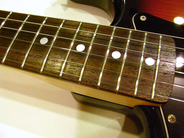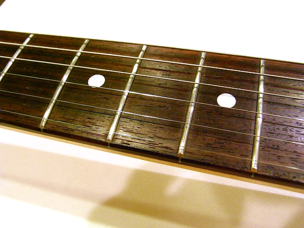 プレイコンディションは非常に良好です。 ネックは反りも無く真っ直ぐにロッド調整済で、 ロッドは適正に調整後、まだ十分に余裕のある状態ですので今後の矯正も可能です。 フレットも大きな減りは無く8分〜9分程度は残っており、へこみや弦溝等もありません。 丁寧に磨きも入れておりますので、光沢も大分取戻し、綺麗なコンディションです。 現在弦高は12フレット上1弦1.2mm、6弦1.5mmとローアクションにセッティングしています。 上記のセッティングで、各ポジション、フレットバズ(ビビリ)や音づまりも無く良好な出音です。 弦高も低く、弾きやすいコンディションです。