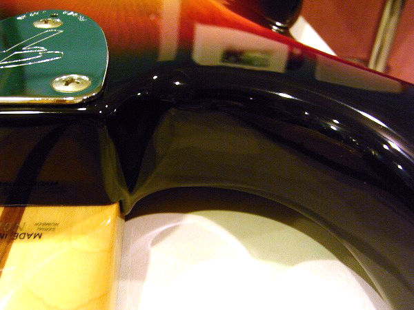 外観的にも美品と言って良い非常にグッドコンディションの1本です。 各部丁寧にクリーニング済で、コンパウンド、ポリッシュによる小さな傷の除去、 研磨、光沢出しを行っておりますので、塗装は光沢も取戻し、ツヤのある綺麗なコンディションです。 ですが、USED品ですので、相応に使用感、細かな傷はございます。 大きな目立つものとしては、ボディ突き出し部の片方の先端に、1cm大程度の塗装欠けがございます。 この部分は黒でタッチアップし、目立たなくしてあります。 以下リンク先に拡大写真もアップしておりますので、そちらもご確認下さい。 その他は、大きな塗装剥がれや打痕は一切無く、ごく細かな擦り傷程度です。 擦り傷も目立つ大きなものは無く、光に当てて角度を変えて見える様な程度の細かな擦り傷です。 ピックガードも演奏による細かな擦り傷がございます。 ハードウェアも磨きを入れてツヤを出しておりますが、除去しきれない若干のくすみ、傷はございます。 全体的には大きなダメージも無く、塗装の光沢もピカピカで非常のコンディションです!