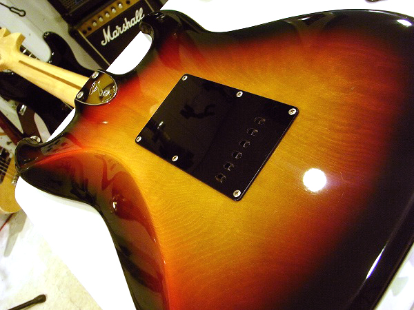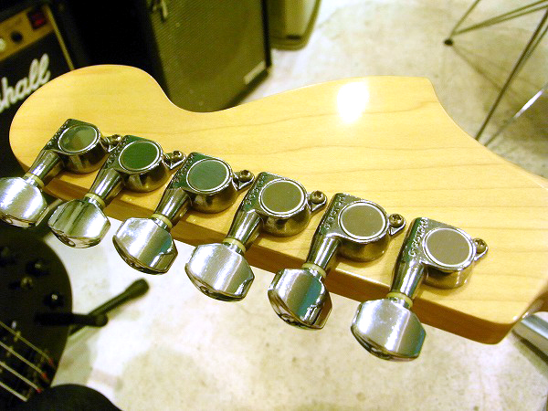 Switch、1Vol、2Toneの仕様。 ピックガードは3プライのブラック、ペグはGROVERのロトマチックタイプです。 カラーは3トーン・サンバーストで、ブラックのピックガードとのマッチングで、 落ち着いた渋いルックスの大人っぽい印象の1本。