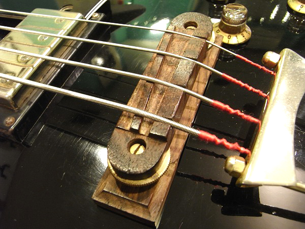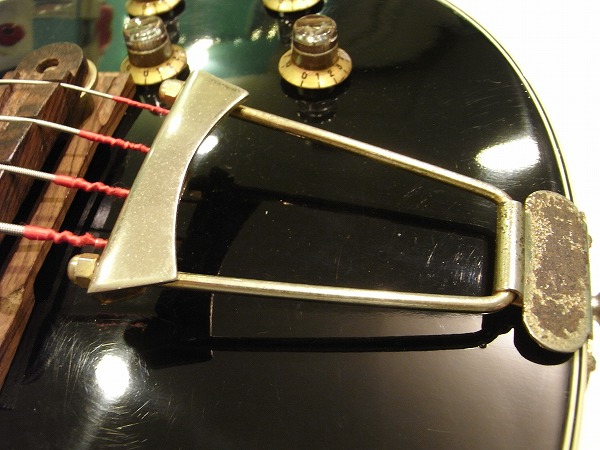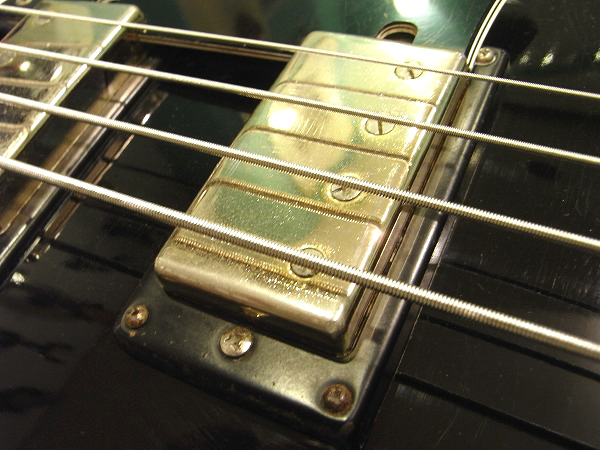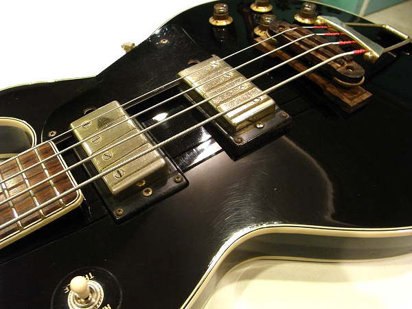 ルックスはブラックのボディにダブルバインディング、ゴールドパーツのマッチング、 ネックもバインディング付で、指板ポジションマークはブロックインレイという、 レス・ポール・カスタムのルックスをそのまま踏襲しつつも、 ブリッジは木製のヴァイオリン・ベースの様なタイプに、テールピース付という、 独特な仕様とルックスが魅力で、こういったルックスはビザール系ならではの面白さ、魅力ですね。 とても個性的な仕様が面白いモデルで、ルックスはGibson Les Paul