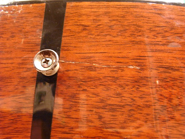 ボディエンドのストラップピン横にも長めの木部クラックがございます。