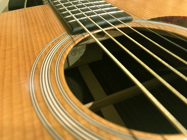 フェイデッド・フィニッシュでコストカットを図りながらも、しっかりとこのモデルならではの個性・特性・魅力を併せ持った素晴らしい1本に仕上がっています。トップコートのクリアー塗装が無い為、トーンのハリと煌びやかさは通常のMartinには劣るものの、トップコートを廃す事で塗膜を薄くし、ギター、木材の本来の鳴りを引き出しており、豊かな生鳴りと音量感、乾いた抜けの良いサウンドと、あたたかみのある落ち着いたトーンを持っています。D-1は通常マホガニーボディ仕様ですが、こちらはローズウッド仕様の希少なモデルです。トップはスプルース単板、サイド&バックはローズウッドです。サイド&バックはラミネート(合板)ですが、トップコート塗装の無い鳴りの良さと、抜けの良さで生鳴り感は十分にカバーされており、硬すぎない落ち着いたトーンでまとまりもあり、歯切れの良いタイトなサウンド、ローズならではの明瞭なサウンドは魅力です。ネックはマホガニーで指板はローズウッドです。ボディ、ネック、指板共にいずれも良質な良い木材が使用されており、木目もとても綺麗です。各種のコストダウンを良い方向に、個性・特性として、そしてバランス良く仕上げられた、さすがはMartinのハイコストパフォーマンスモデルです。べっ甲柄のピックガードやボディバインディングなどシンプルながらも拘りのある存在感のあるルックスも魅力です。ペグはMartinロゴ入りロトマチックタイプです。