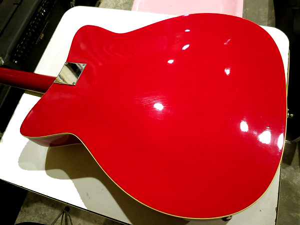 少し木目が透けて見えるレトロ・レッドのカラーと、サウンドホール、
