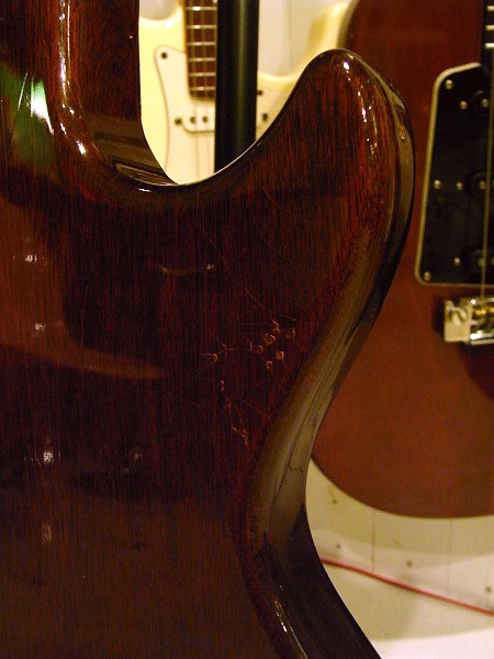 外観的にもヴィンテージとしては綺麗なコンディションを保っています。 各部クリーニング済で、コンパウンド、ポリッシュによる小さな傷の除去、光沢出しを行っておりますので ボディ、ハードウェア共に大分光沢も取戻し、ツヤのある状態です。 ただし、1964年製のヴィンテージ・ギターですので、 使用感、打痕、擦り傷、塗装剥がれは相応に多数ございます。 特筆すべき大きなものとしては、ネック裏に1cm大程度の円形の塗装剥がれ、 ボディ裏に2cm大程度の塗装剥がれがございます。 その他、ヘッドの先端のエッジ部分には小さな欠け、塗装剥がれがあります。 塗装は前述の様にラッカー塗装のひび割れであるウェザークラックが全体に出ています。 金属パーツにはややくすみが出ている部分もございます。 全体的に大きなひどい塗装剥がれや不自然なダメージは無く、 ヴィンテージとしては良好な外観コンディションで綺麗な状態を保っていますが、 ヴィンテージ・ギターにある程度知識とご理解のある方向けのギターです。
