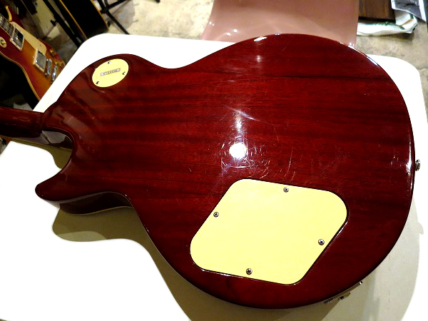 ボディはバックマホガニー+メイプルトップ、ネックはマホガニーのセットネック仕様です。
