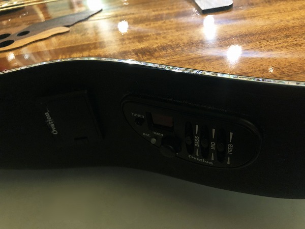 トップにはエキゾチックウッド、フィギュアド・コアを配し、美しく個性的な木目のルックスが魅力です。ボディバックはOvationならではのリラコード製ミッドデプス・スタイルで、深い鳴りと音量感ながら、クリアーな高音域なのが特徴的なサウンドです。レスポンスも良く、ブリリアントかつ低音もしっかりとある豊かな鳴り感です。ネックはマホガニーのローズウッド指板で、ナット幅43mm、ややゆるやかなVシェイプの細身の弾きやすいネックはエレキからの持ち換えでも違和感ないほどです。ピックアップにはオリジナルのピエゾ・ピックアップに、3バンドEQとTUNERも搭載のプリアンプ搭載で、手元でのサウンドメイキング、調整も可能となっています。アンプでの出音もOvationらしいブリリアントかつアコースティカルなサウンドで、ソロ弾き語りやバンドセットでも、アコースティックサウンドをしっかりとバランス良く提供してくれます。