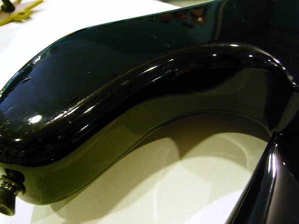 外観的には、各部丁寧にクリーニング済で、コンパウンド、ポリッシュによる小さな傷の除去、 研磨、光沢出しを行っておりますので、塗装は光沢も取戻し、ツヤのある綺麗なコンディションです。 ですが、小さな塗装剥がれ、擦り傷、打痕等やや多く、相応のUSEDプレイヤーズコンディションです。 ボディサイド、ボディバック、ヘッドのエッジ部分には多数の塗装剥がれ、塗装欠けがございます。 塗装欠けの部分は、目立たないように全て黒でタッチアップし、 あまり目立たない様にはしましたが、再塗装はかけておりませんので、欠け部分の段差は残っています。 以下のリンク先に写真を多数アップしておりますので、そちらもご確認いただけます様お願いいたします。 その他打痕による小さなへこみが多数ある他、擦り傷なども多数ございます。 ハードウェアも出来る限りコンパウンドをかけ、光沢出しを行っていますが、 落としきれないくすみ、経年による光沢の落ち、メッキ剥がれが全体的にございます。 ペグは新品のものを取り付けましたので、ピカピカの状態です。 また、コントロールノブの一つのトップパネル、ラバー部分が欠品して無くなっています。