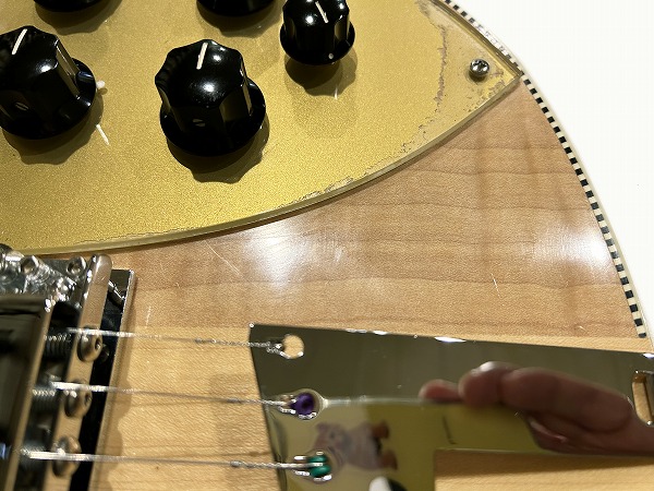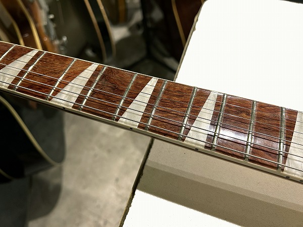プレイコンディションは非常に良好です。ネックはロッド調整済みで反りも無く真っ直ぐで良好な状態に調整済です。ロッドは2本とももまだ十分に余裕があります。フレットも大きな減りは無く、まだ8分程度は残っており、へこみや弦溝もありません。山は元々低いタイプです。弾きやすく、各ポジション出音も良好でプレイコンディション非常に良好です。フレットは磨きも入れており、光沢もまだまだピカピカの綺麗なコンディションです。指板も大きな減りやダメージは無く、丁寧にクリーニング、磨きも入れておりますので、綺麗で良好なコンディションになっています。ナットもほとんど減り無く非常に良好なコンディションです。