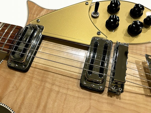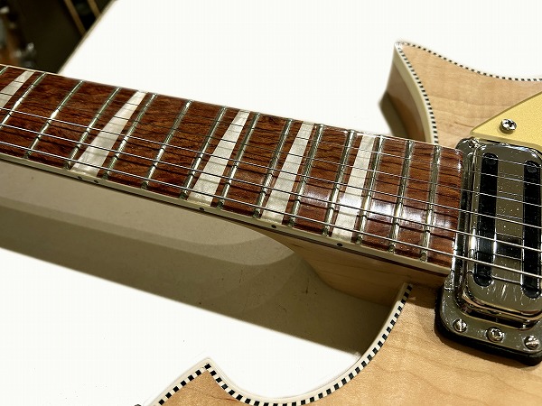 ボディは上位モデルかつMaplegloのモデルだけあり、トラ杢の浮かぶフレイムメイプルが採用され、ゴールドのピックガード、チェッカー・バインディング、さらにロッドカバーも、凹凸のあるプラスチックロゴタイプではなく、裏からロゴが印刷されたヴィンテージタイプのゴールド・ネームプレートで、これらのマッチングで、美しくかつ上質で存在感あり、抜群の格好良さを誇る素晴らしいルックスです。ボディはメイプル、ネックもメイプルのスルーネック構造で、指板はローズウッドといった仕様です。小ぶりなボディスタイルながらスルーネック構造のメイプルネックは、やや太めのしっかりとしたネックシェイプとあいまって、非常にタイトでハリとアタック感のあるサウンド、ファットかつ抜けの良いサウンドで、かつ豊かなサステインのサウンドを生み出しています。
