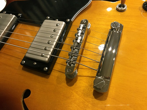 NS アルニコピックアップを搭載。クリアーさと鈴鳴り感を持ちながら、耳に痛くないまろやかかつ、いなたさのあるトーンで、ウォームさもあり、ヴィンテージライクなサウンドです。本体とのマッチングで、箱鳴り感のあるウォームな響き、タイトさもありながら硬すぎずソフトで、こなれたまとまり感のあるサウンドで、グッドサウンドなセミアコサウンドに仕上がっています。クリーン〜ナチュラルな軽いクランチで最も魅力を発揮するモデルかなと思います。