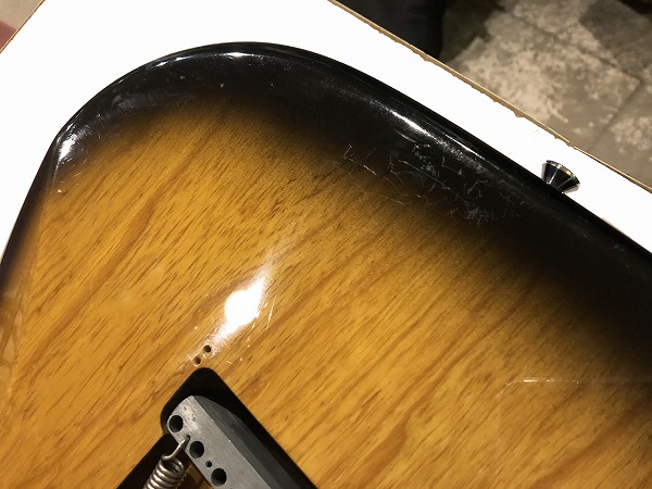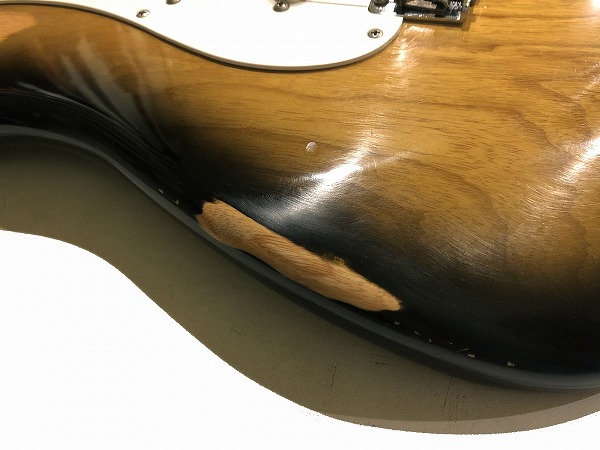 外観的には、ボディに打痕、小さな塗装剥がれ、擦り傷、経年変化など、相応に多々見られ、使用感、経年感のあるプレイヤーズコンディションで、また、後からレリック加工が施されています。ボディトップ、コンター部サイドに塗装の擦れ落ちがあり、全体的に研磨跡の擦り傷も見られますので、後からのレリック加工と思われます。プロショップによるものではないと思われますが、雰囲気はなかなか良く、ヴィンテージライクな格好良いルックスです。バックパネル、アームバーは欠品、ケースはおまけとしてソフトケースをお付けいたします。