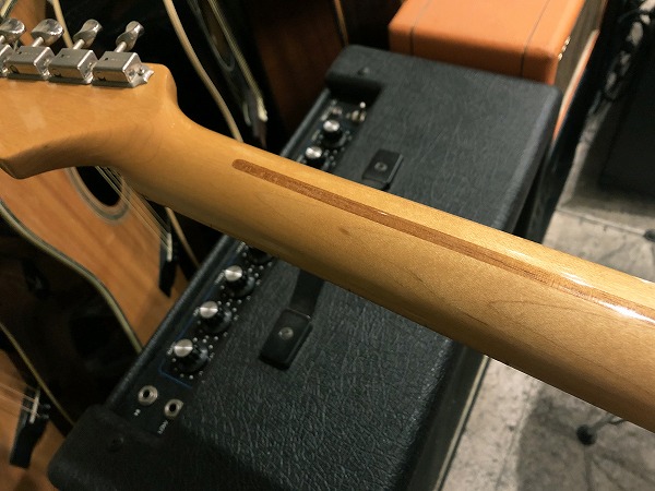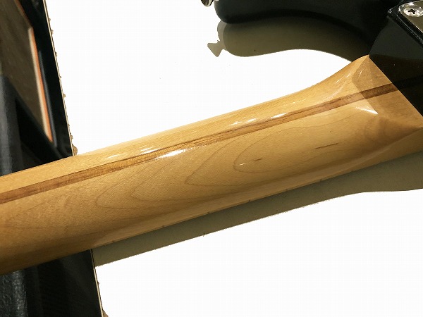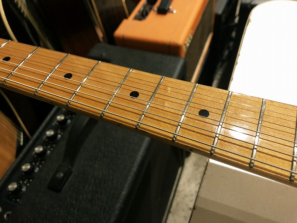 プレイコンディションは良好です。ネックはロッド調整済みで反りも無く真っ直ぐで良好な状態です。フレットは相応に使用感、若干の減りは見られ、6分程度の残りとなっており、軽度のへこみもありますが、大きなへこみや弦溝は無く、ローアクションセッティング可能で出音も良好です。フレットは丁寧に磨きを入れ、大分光沢も取り戻し、綺麗なコンディションになっています。指板も軽度の減り、小傷は相応にありますが、大きな減りやダメージは無く、指板も丁寧にクリーニング、磨きも行っており、綺麗で良好なコンディションになっています。ナットも大きな減り無く、良好なコンディションです。