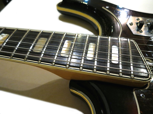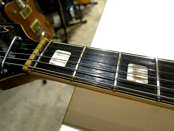 ネックは細身のネックでブロックタイプのポジションマーク・インレイ入り、