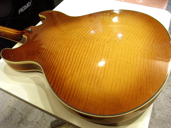 センターブロックのソリッドマホガニー、バックもアーチドのシカモアで、