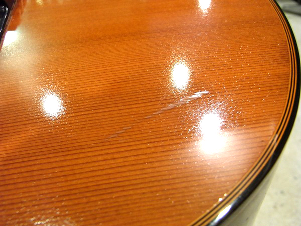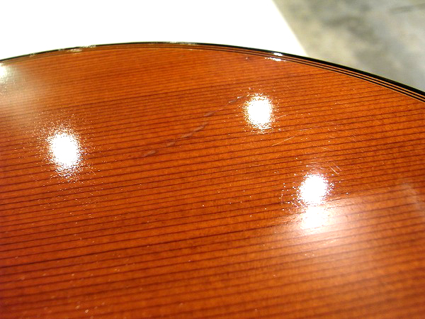外観的には相応に使用感、傷のあるUSEDコンディションですが、 大きな目立つ塗装剥がれや、木部のクラックなどのひどいダメージはありません。 全体的に弾き傷など、細かな擦り傷がある他、トップにやや目立つ擦り傷が2ヶ所あります。 また、ヘッドの裏に小さな打痕とそれに伴う塗装剥がれがいくつかございます。 使用上は問題ありません。 また、ペグは交換されており、元のペグが付いていたビスの穴が残っています。 全体的に丁寧にクリーニング、磨きを行い、ラッカー塗装は光沢も取戻し、 ツヤのある綺麗な状態で、ラッカー独特のザラついた質感が良いです。 相応に使用感、小傷のあるUSEDコンディションですが、 全体的にはまだまだ綺麗なコンディションと言って良いかと思います。