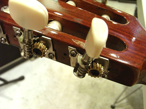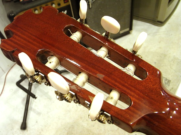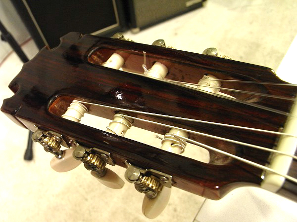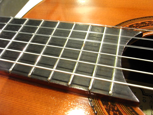 ネックは反りも無く、綺麗に真っ直ぐな良好なコンディションです。 フレットも相応に減りはあるものの、まだ7分程度は残っており、 大きなへこみや弦溝等も無く、まだまだ十分に使用出来る問題無い状態です。 丁寧に磨きも入れており、光沢も取戻し、綺麗なコンディションです。 トップ板のふくらみも無く、ネック起きもありません。 ブリッジのエンド側に軽度の浮きがありますが、固着されており、使用上は問題ありません。 現在弦高は9フレット上1弦3.5mm、6弦4mmで、クラシックギターとしては基準範囲の弦高です。 少し高めで弾きにくいというプレイヤーの方は、ブリッジサドルの高さの残りがありますので、 お好みにより加工〜設定していただければ幸いです。