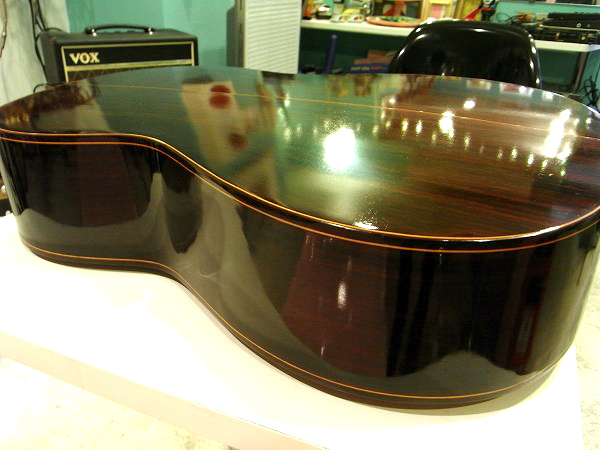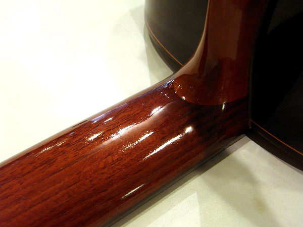 .jpg) また、サウンドホール内から、ブレイシングや作り込み方、接着具合などを見ても、 とても丁寧に品質高く作られている他、 ボディがダブルバインディングである点や、装飾の入り方、ネックジョイント部の仕込み方等を見ても、 高級モデルの様な丁寧で上質な仕込み方です。 塗装は全てオール・ラッカーの極薄塗装で、ラッカーならではのザラついた質感が高級感を高めています。 ラッカー塗装は非常に薄く塗装出来、ギター本来の鳴りを損なわず、