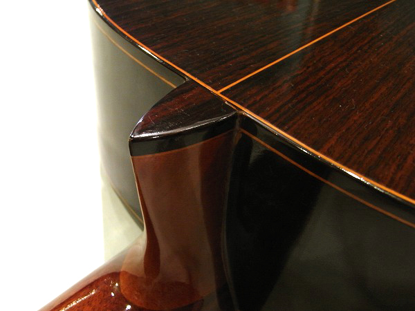まず、トップは美しい綺麗に木目の入ったシダーで、厚みのある単板仕様です。 単板は、いわゆる1枚板で、合板のように重ねあわせて作られた板と異なり、弦振動をダイレクトに伝えますので、 非常に響き、鳴りが良くなる為、高級機種で採用されています。 サイド&バックも非常に綺麗な美しい木目のローズウッドで、 木目の入り方からもハカランダではないかとも思われますが、 正確には不明な為、ローズウッドとさせていただきます。 いずれにしてもとても綺麗な木目で、良質な木材が使われています。 サイド&バックは断面を見る事が出来ない為、単板か合板か判断出来かねますが、 サウンドホール内から木目を見る限り、同様に綺麗に木目が入っており、単板である可能性もあります。