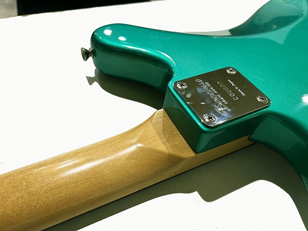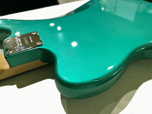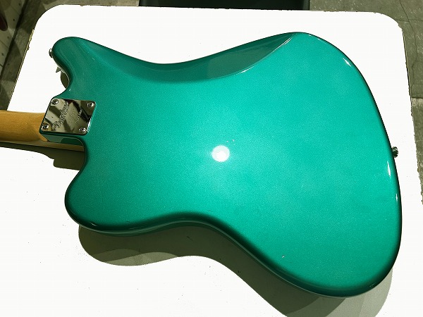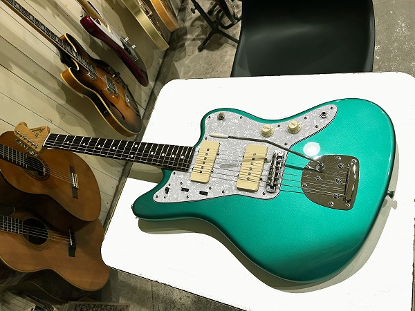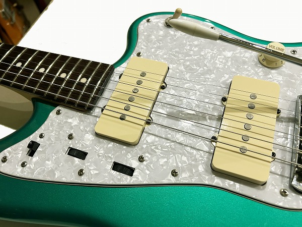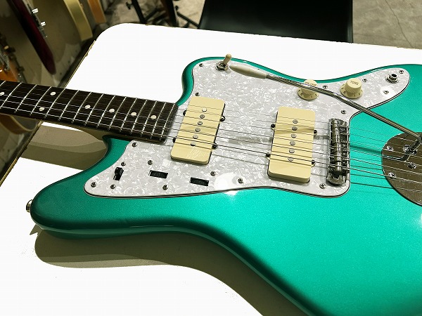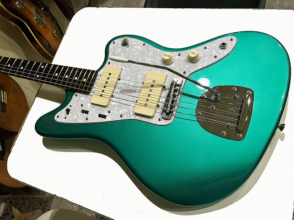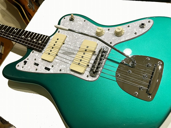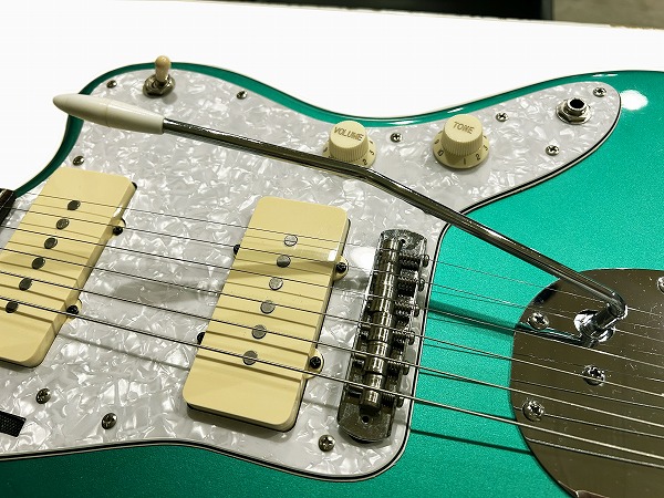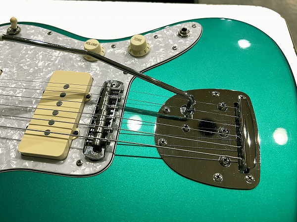 ルックス的にもヘッドシェイプ以外はほぼ忠実にヴィンテージライクなジャズマスターを踏襲しつつ、ホワイトパールピックガードに、カラーはグリーン・メタリックというFenderでもあまり見られない珍しいカラーリングで、個性的ながらクラシカルさもあり、格好良い1本です。