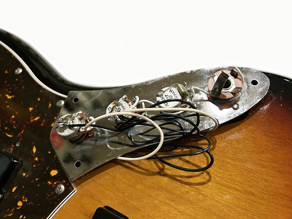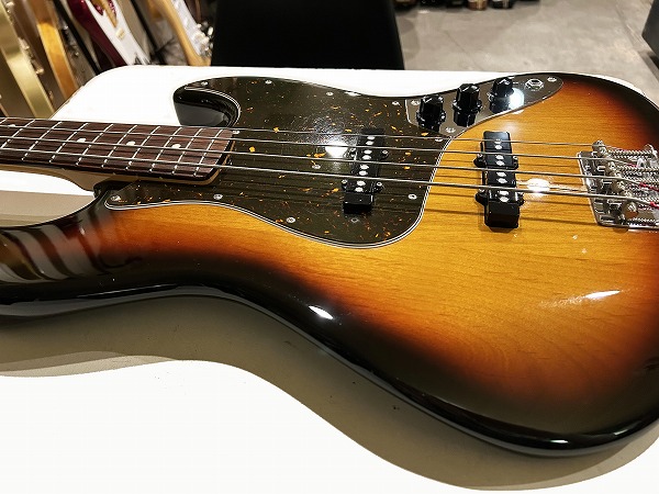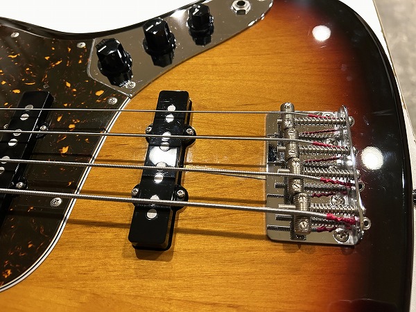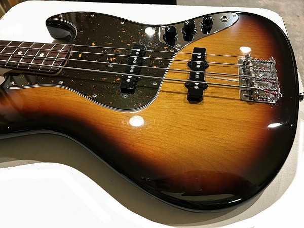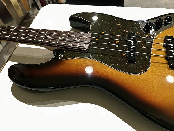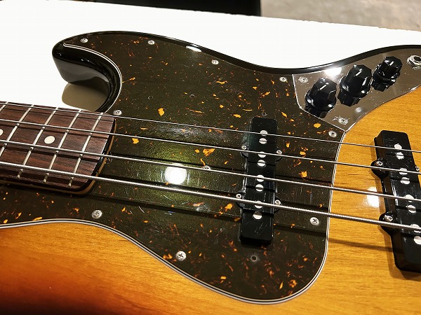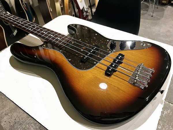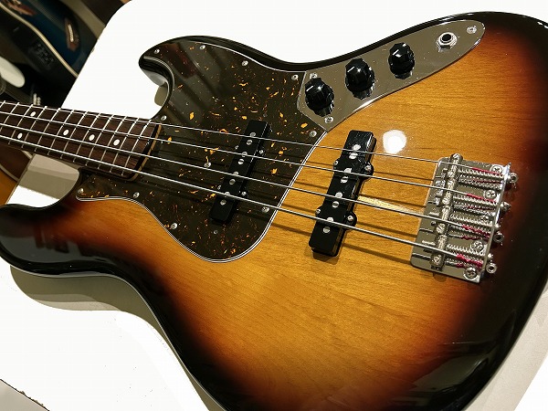 クラシカルな1962年仕様のヴィンテージスタイルを再現したFender Japan によるJazz Bassで、その高い再現度と本格的な仕様、しっかりとした作りは流石です。ボディはしっかりとアルダーを使用した上位モデルで、ネックはメイプルのローズウッド指板、ブリッジサドルはヴィンテージライクなスパイラルサドル、ペグはオープンバック、カラーは2トーン・サンバーストにべっ甲柄ピックガードを搭載、ピックアップはUS製のJB