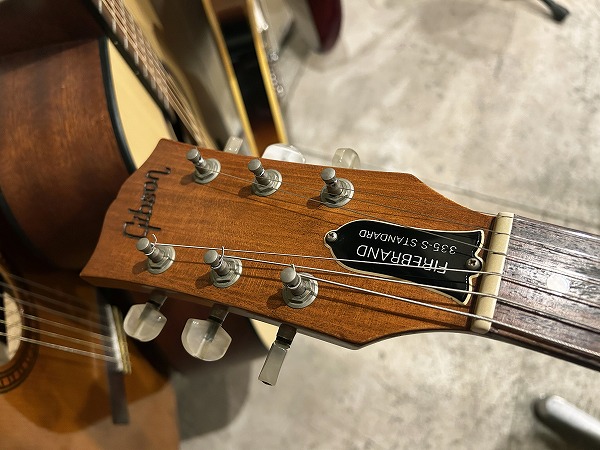 刻印入りシャーラータイプです。ヘッドロゴは特徴的な彫りのGibsonロゴ、ロッドカバーには「FIREBRAND 335-S STANDARD」の記載があり、オリジナルです。